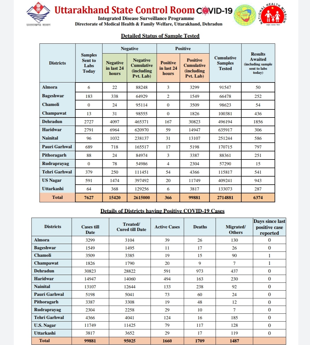 बता दें कि आज सबसे ज्यादा मामले देहरादून से सामने आए हैं। आपको बता दे कि देहरादून में आज 167 मामले सामने आए हैं तो वहीं अल्मोड़ा में तीन, बागेश्वर में दो, चमोली में 0, चंपावत में 0, हरिद्वार में 59, नैनीताल में 31, पौड़ी गढ़वाल में 17, पिथौरागढ़ में तीन, रुद्रप्रयाग में 4, टिहरी में 54, उधम सिंह नगर में 20 और उत्तरकाशी में 6 मामले सामने आए हैं। जिसके बाद प्रदेश में कुल मरीजों का आंकड़ा 99881 तक पहुंच गया है।