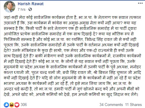 हरीश रावत ने लिखा कि जहां-कहीं मेरा कोई सार्वजनिक कार्यक्रम होता है, भा.ज.पा. के नेतागण एक सवाल तत्काल उछालते हैं कि, उस कार्यक्रम में कांग्रेस का अमुख-अमुख नेता क्यों नहीं आया? क्या यह सम्भव है कि, किसी पार्टी के सारे नेतागण एक ही सार्वजनिक समारोह में या पार्टी द्वारा आयोजित प्रत्येक सार्वजनिक समारोह में एक साथ दिखाई दें? क्या यह भौतिक रूप से फिजिकली सम्भव है और कोई भा.ज.पा. का व्यक्ति, त्रिवेन्द्र सिंह रावत जी से क्यों नहीं पूछता कि, उनके सार्वजनिक समारोहों में उनके पार्टी के वर्तमान अध्यक्ष क्यों नहीं दिखाई देते? उनके मंत्रिमंडल के कुछ ही साथी, एक मेयर और एक-दो राज्यमंत्री ही क्यों उनके साथ दिखाई देते हैं? बाकी मंत्रीगण क्यों उनके सार्वजनिक कार्यक्रमों में, राजकीय कार्यक्रमों में नहीं दिखाई देते हैं? कोई भा.ज.पा. के लोगों से यह सवाल क्यों नहीं पूछता कि उनके मुख्यमंत्री या प्रदेश अध्यक्ष के सार्वजनिक कार्यक्रमों में उनकी पार्टी के पूर्व अध्यक्ष, मनोहर कान्त ध्यानी जी, पूरन चन्द्र शर्मा जी, बची सिंह रावत जी, श्री बिशन सिंह चुफाल जी आदि क्यों नहीं दिखाई देते हैं? यदि वो लोग मुख्यमंत्री जी के कार्यक्रमों में नहीं आ रहे हैं या प्रदेश भाजपा अध्यक्ष के कार्यक्रमों नहीं आ रहे हैं, तो इसे मान लिया जाय कि, भा.ज.पा. के अन्दर धड़े बन्दी है, तो भा.ज.पा. हमारी पार्टी में जुएं खोजने बन्द करें और अपनी भैंसों को देखें, अपने खोट को, अपनी कमियों को देखें, हम अपनी कमियों का खुद निदान कर लेंगे।
