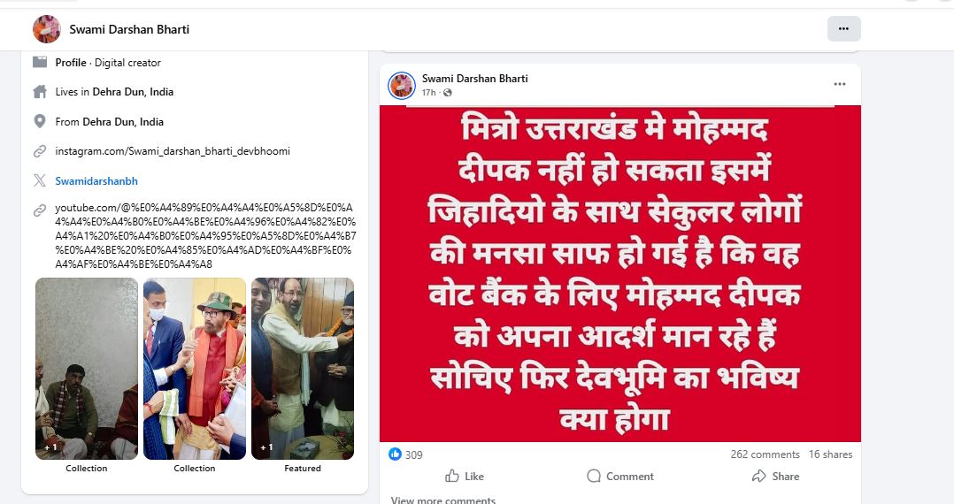 स्वामी दर्शन भारती ने कोटद्वार में बढ़ते बवाल पर पोस्ट किया है। उन्होंने लिखा ‘मित्रों उत्तराखंड मे मोहम्मद दीपक नहीं हो सकता, इसमें जिहादियों के साथ सेकुलर लोगों की मनसा साफ हो गई है कि वह वोट बैंक के लिए मोहम्मद दीपक को अपना आदर्श मान रहे हैं। सोचिए फिर देवभूमि का भविष्य क्या होगा।
