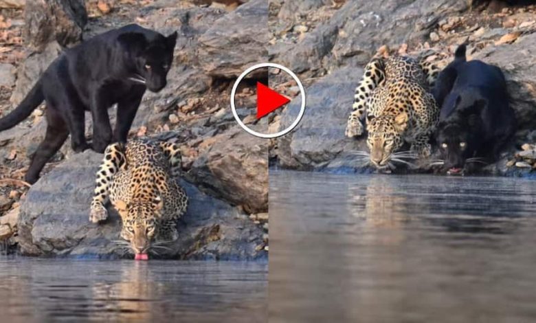 दुर्लभ नजारा!, एक साथ पानी पीते दिखे तेंदुआ और ब्लैक पैंथर, वीडियो वायरल