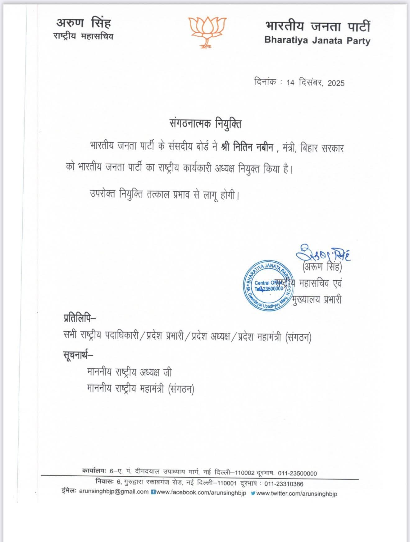 बता दें नितिन नबीन वर्तमान में बिहार में कैबिनेट मंत्री हैं। आदेश में कहा गया है कि नितिन नबीन की ये नियुक्ति तत्काल प्रभाव से लागू होगी।