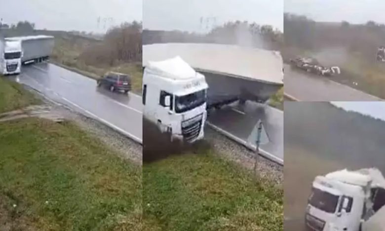 वीडियो में देखा जा सकता है कि एक कार सामान्य स्पीड से सड़क पर आगे बढ़ रही है। सामने से एक भारी भरकम ट्रक आता है। अचानक से ट्रक के आगे वाला हिस्सा अपना बैलेंस खोकर मुड़ जाता है।