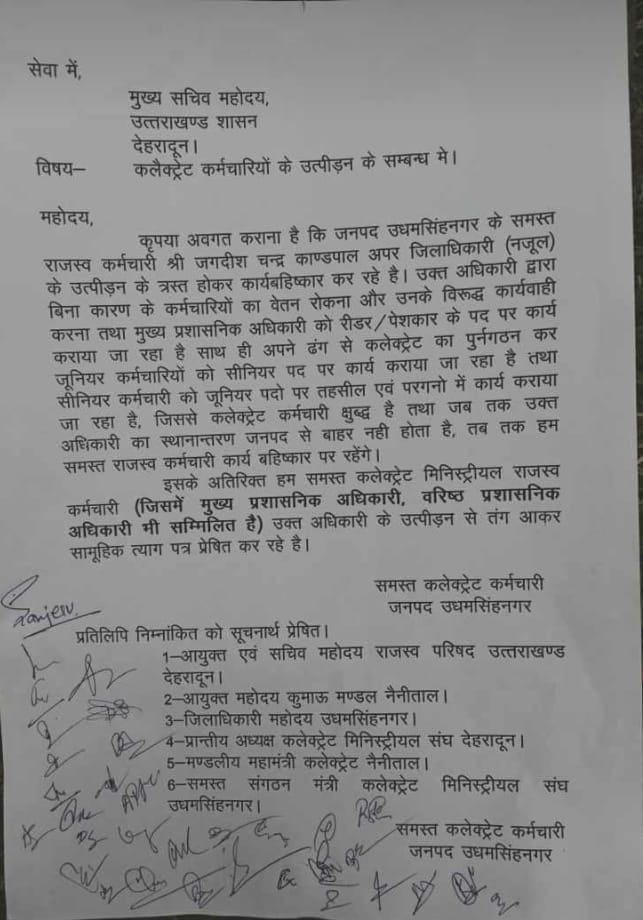 मिले पत्र के अनुसार कलेक्ट्रेट कर्मियों ने उधमसिंह नगर अपर जिलाधिकारी जगदीश चंद्र कांडपाल पर उत्पीड़न का आरोप लगाया है और साथ ही आवाज बुलंद करते हुए कार्य बहिष्कार का ऐलान किया है. आज सभी कर्मचारियों ने सामूहिक त्यागपत्र की घोषणा की है और साथ ही प्रमुख सचिव को पत्र सौंपा है.