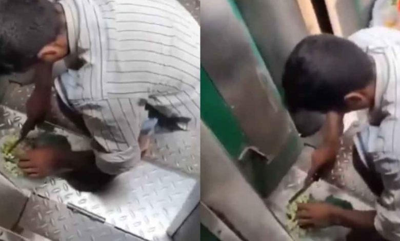 दरअसल वायरल वीडियो में एक शख्स ट्रेन के अंदर, टॉयलेट के पास बैठा हुआ दिखाई देता है। हैरानी की बात तो ये है कि वो उसी ट्रेन के गंदे फर्श पर सब्जियां काट रहा है। वहीं फर्श जिसपर लोग पैर रखने से भी बचते है। उसी पर वो खाने की तैयारी कर रहा है। उसके पास बर्तन और कुछ सामान भी है।